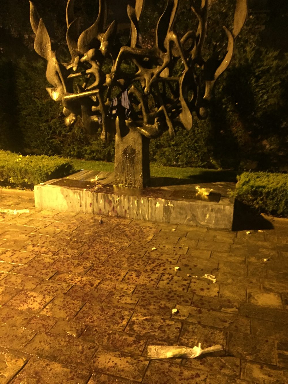 Ο εφησυχασμός, η άγνοια και η ανοχή, απέναντι σε τέτοιες συμπεριφορές ανοίγουν δυστυχώς σε αυτούς που σήμερα βάφουν κόκκινο ένα μνημείο που δημιουργήθηκε για να υπενθυμίζει τις συνέπειες μιας εποχής κατά την οποία οι ανθρωπιστικές αξίες καταβαραθρώθηκαν και αθώοι άνθρωποι στιγματίστηκαν και δολοφονήθηκαν στο βωμό φασιστικών ιδεολογιών, το δρόμο για ένα επόμενο χειρότερο βήμα.